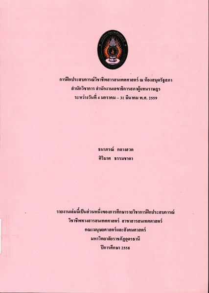การฝึกประสบการณ์วิชาชีพสารสนเทศศาสตร์ ณ ห้องสมุดรัฐสภา สำนักวิชาการ สำนักงานเลขาธิการสภาผูู้แทนราษฎร ระหว่างวันที่ 4 มกราคม - 31 มีนาคม พ.ศ. 2559 / ธนาภรณ์ กลางฮวด, ศิริมาศ ธรรมชาดา.