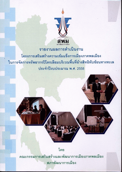 รายงานผลการดำเนินงานโครงการเสริมสร้างความเข้มแข็งการเมืองภาคพลเมืองในการจัดการทรัพยากรปิโตรเลียมบริเวณพื้นที่อ้างสิทธิทับซ้อนทางทะเล ประจำปีงบประมาณ พ.ศ. 2558 / โดย คณะกรรมการเสริมสร้างและพัฒนาการเมืองภาคพลเมือง สภาพัฒนาการเมือง.