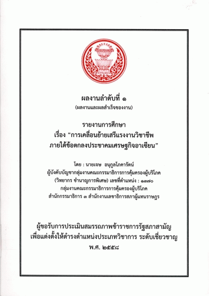 การเคลื่อนย้ายเสรีแรงงานวิชาชีพภายใต้ข้อตกลงประชาคมเศรษฐกิจอาเซียน / เจษ อนุกูลโภคารัตน์.