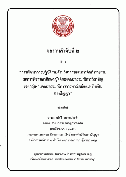 การพัฒนาการปฏิบัติงานด้านวิชาการและการจัดทำรายงานผลการพิจารณาศึกษาญัตติของคณะกรรมาธิการวิสามัญของกลุ่มงานคณะกรรมาธิการการพาณิชย์และทรัพย์สินทางปัญญา / พัชรี สรวมประคำ.