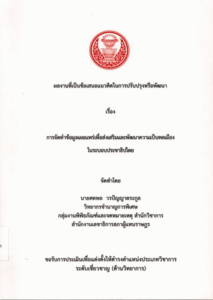 การจัดทำข้อมูลเผยแพร่เพื่อส่งเสริมและพัฒนาความเป็นพลเมืองในระบอบประชาธิปไตย / ศตพล วรปัญญาตระกูล.