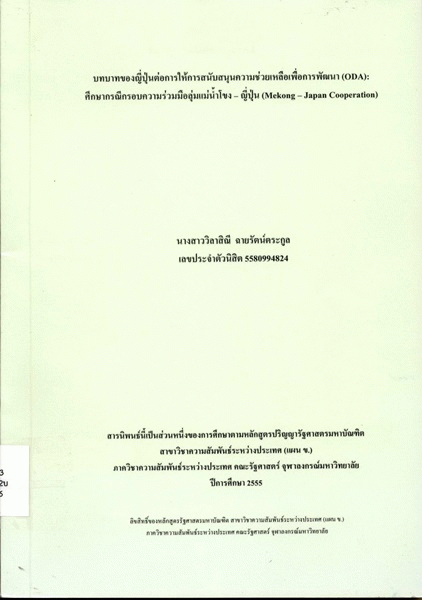 บทบาทของญี่ปุ่นต่อการให้การสนับสนุนความช่วยเหลือเพื่อการพัฒนา (ODA) : ศึกษากรณีกรอบความร่วมมือลุ่มแม่น้ำโขง-ญี่ปุ่น (Mekong-Japan Cooperation) / วิลาสิณี ฉายรัตน์ตระกูล.