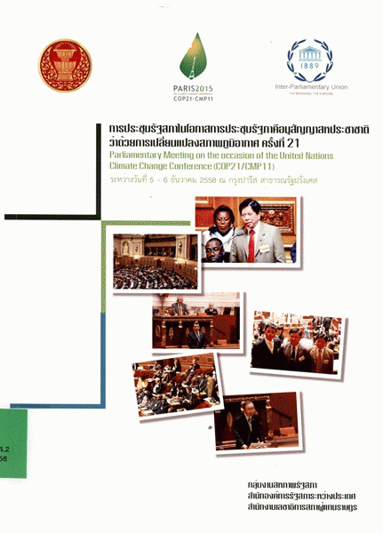 การประชุมรัฐสภาในโอกาสการประชุมรัฐสภาภาคีอนุสัญญาสหประชาชาติว่าด้วยการเปลี่ยนแปลงสภาพภูมิอากาศ ครั้งที่ 21 Parliamentary meeting on the occasion of the United Nations climate change conference (COP21/CMP11) ระหว่างวันที่ 5 - 6 ธันวาคม 2558 ณ กรุงปารีส สาธารณรัฐฝรั่งเศส / สำนักองค์การรัฐสภาระหว่างประเทศ สำนักงานเลขาธิการสภาผู้แทนราษฎร.