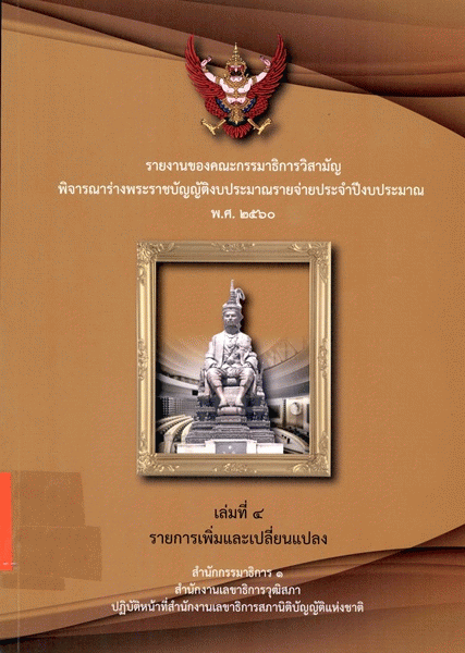 รายงานของคณะกรรมาธิการวิสามัญพิจารณาร่างพระราชบัญญัติงบประมาณรายจ่าย ประจำปีงบประมาณ พ.ศ.2560 เล่มที่ 4 รายการเพิ่มและเปลี่ยนแปลง / สำนักกรรมาธิการ 1 สำนักงานเลขาธิการวุฒิสภา ปฏิบัติหน้าที่สำนักงานเลขาธิการสภานิติบัญญัติแห่งชาติ.