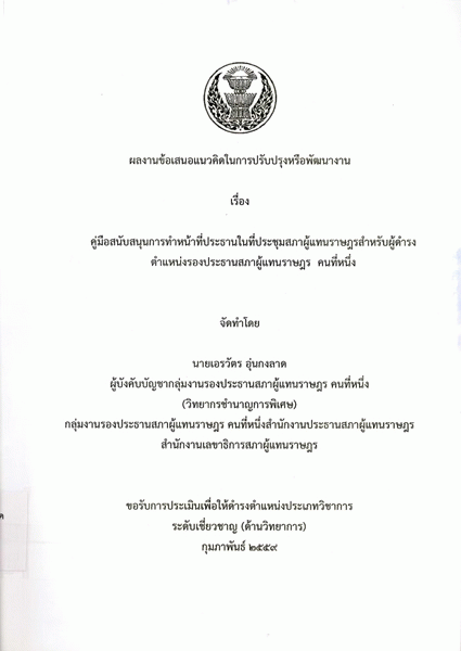 คู่มือสนับสนุนการทำหน้าที่ประธานในที่ประชุมสภาผู้แทนราษฎรสำหรับผู้ดำรงตำแหน่งรองประธานสภาผู้แทนราษฎร คนที่หนึ่ง / เอรวัตร อุ่นกงลาด.
