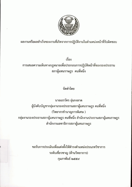 การเสนอความเห็นทางกฎหมายเพื่อประกอบการปฏิบัติหน้าที่ของรองประธานสภาผู้แทนราษฎร คนที่หนึ่ง / เอรวัตร อุ่นกงลาด.