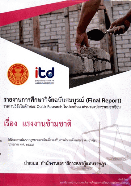 แรงงานข้ามชาติ (รายงานวิจัยในลักษณะ Quick Research ในประเด็นเร่งด่วนของประชาคมอาเซียน ภายใต้โครงการพัฒนากฎหมายภายในเพื่อรองรับการทำงานด้านประชาคมอาเซียน ปีงบประมาณ พ.ศ. 2559) / กมลินทร์ พินิจภูวดล, ศุภศิษฏ์ ทวีแจ่มทรัพย์, น้ำผึ้ง ทัศนัยพิทักษ์กุล.