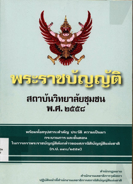 พระราชบัญญัติสถาบันวิทยาลัยชุมชน พ.ศ. 2558 พร้อมทั้งสรุปสาระสำคัญ ประวัติ ความเป็นมา กระบวนการ และขั้นตอนในการตราพระราชบัญญัติดังกล่าวของสภานิติบัญญัติแห่งชาติ / สำนักกฎหมาย สำนักงานเลขาธิการวุฒิสภา ปฏิบัติหน้าที่สำนักงานเลขาธิการสภานิติบัญญัติแห่งชาติ.