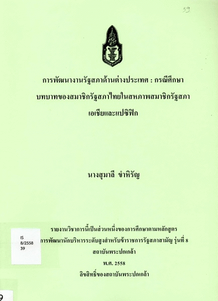 การพัฒนางานรัฐสภาด้านต่างประเทศ : กรณีศึกษาบทบาทของสมาชิกรัฐสภาไทยในสหภาพสมาชิกรัฐสภาเอเชียและแปซิฟิก / สุมาลี ขำหิรัญ ; สถาบันพระปกเกล้า.