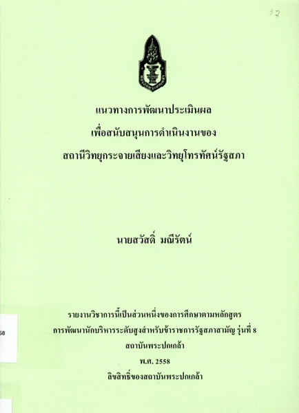 แนวทางการพัฒนาประเมินผลเพื่อสนับสนุนการดำเนินงานของสถานีวิทยุกระจายเสียงและวิทยุโทรทัศน์รัฐสภา / สวัสดิ์ มณีรัตน์.