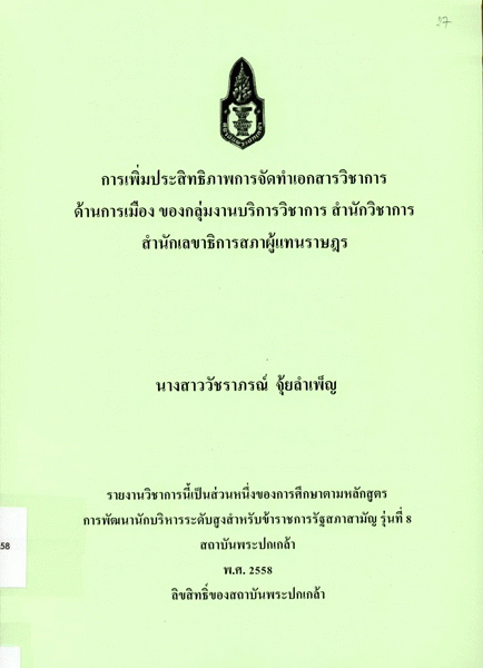 การเพิ่มประสิทธิภาพการจัดทำเอกสารวิชาการด้านการเมือง ของกลุ่มงานบริการวิชาการ สำนักวิชาการ สำนักงานเลขาธิการสภาผู้แทนราษฎร.