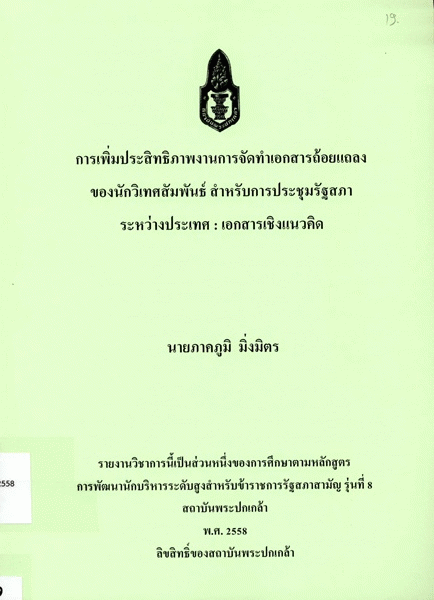 การเพิ่มประสิทธิภาพงานการจัดทำเอกสารถ้อยแถลงของนักวิเทศสัมพันธ์ สำหรับการประชุมรัฐสภาระหว่างประเทศ : เอกสารเชิงแนวคิด / ภาคภูมิ มิ่งมิตร.