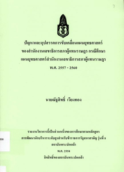ปัญหาและอุปสรรคการขับเคลื่อนแผนยุทธศาสตร์ของสำนักงานเลขาธิการสภาผู้แทนราษฎร กรณีศึกษาแผนยุทธศาสตร์สำนักงานเลขาธิการสภาผู้แทนราษฎร พ.ศ. 2557 - 2560