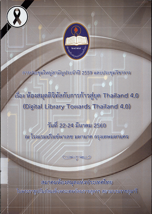 การประชุมใหญ่สามัญประจำปี 2559 และประชุมวิชาการ เรื่อง ห้องสมุดดิจิทัลกับการก้าวสู่ยุค Thailand 4.0 (Digital Library Towards Thailand 4.0) วันที่ 22-24 มีนาคม 2560 ณ โรงแรมปรินซ์พาเลซ มหานาค กรุงเทพมหานคร / สมาคมห้องสมุดแห่งประเทศไทยในพระราชูปถัมภ์สมเด็จพระเทพรัตนราชสุดาฯ สยามบรมราชกุมารี ; บรรณาธิการ สุจิตร สุวภาพ.