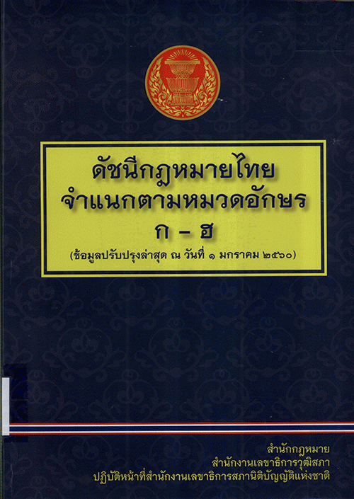 ดัชนีกฎหมายไทยจำแนกตามหมวดอักษร (ข้อมูลปรับปรุงล่าสุด ณ วันที่ 1 มกราคม 2560) / สำนักกฎหมาย สำนักงานเลขาธิการวุฒิสภา ปฏิบัติหน้าที่สำนักงานเลขาธิการสภานิติบัญญัติแห่งชาติ.