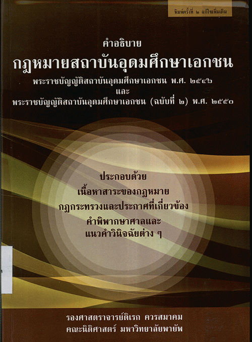 คำอธิบายกฎหมายสถาบันอุดมศึกษาเอกชน ตามพระราชบัญญัติสถาบันอุดมศึกษาเอกชน พ.ศ. 2546 และพระราชบัญญัติสถาบันอุดมศึกษาเอกชน (ฉบับที่ 2) พ.ศ. 2550 / ดิเรก ควรสมาคม.