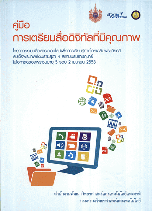 คู่มือการเตรียมสื่อดิจิทัลที่มีคุณภาพ โครงการระบบสื่อสาระออนไลน์เพื่อการเรียนรู้ทางไกลเฉลิมพระเกียรติสมเด็จพระเทพรัตนราชสุดา ฯ สยามบรมราชกุมารี ในโอกาสฉลองพระชนมายุ 5 รอบ 2 เมษายน 2558 / บุญเลิศ อรุณพิบูลย์ และบุญเกียรติ เจตจำนงนุช.