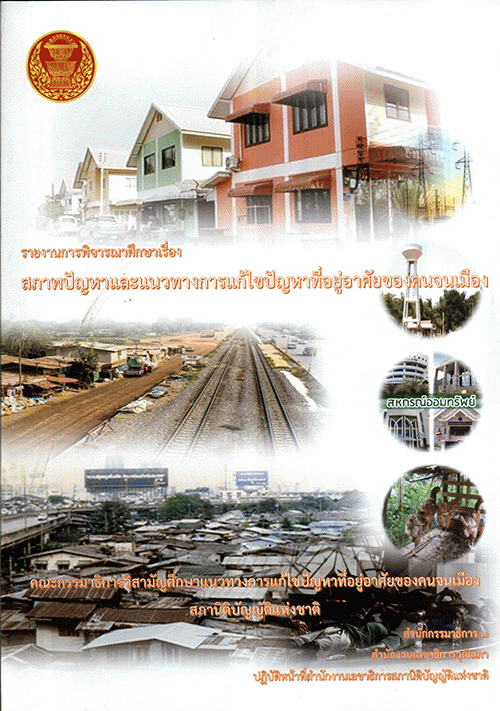 รายงานการพิจารณาศึกษา เรื่อง สภาพปัญหาและแนวทางการแก้ไขปัญหาที่อยู่อาศัยของคนจนเมือง โดย คณะกรรมาธิการวิสามัญศึกษาแนวทางการแก้ไขปัญหาที่อยู่อาศัยของคนจนเมือง สภานิติบัญญัติแห่งชาติ / สำนักกรรมาธิการ 3 สำนักงานเลขาธิการวุฒิสภา ปฏิบัติหน้าที่สำนักงานเลขาธิการสภานิติบัญญัติแห่งชาติ.