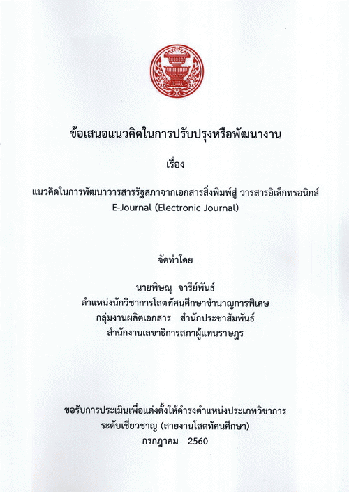 แนวคิดในการพัฒนาวารสารรัฐสภาจากเอกสารสิ่งพิมพ์สู่ วารสารอิเล็กทรอนิกส์ E-Journal (Electronic Journal) / พิษณุ จารีย์พันธ์.