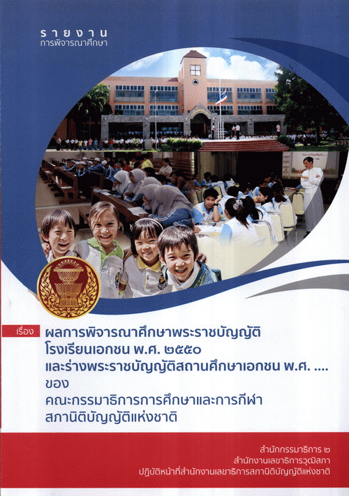 รายงานการพิจารณาศึกษา เรื่อง ผลการพิจารณาศึกษาพระราชบัญญัติโรงเรียนเอกชน พ.ศ. 2550 และร่างพระราชบัญญัติสถานศึกษาเอกชน พ.ศ. .... ของคณะกรรมาธิการการศึกษาและการกีฬา สภานิติบัญญัติแห่งชาติ / สำนักกรรมาธิการ 3 สำนักงานเลขาธิการวุฒิสภา ปฏิบัติหน้าที่สำนักงานเลขาธิการสภานิติบัญญัติแห่งชาติ.