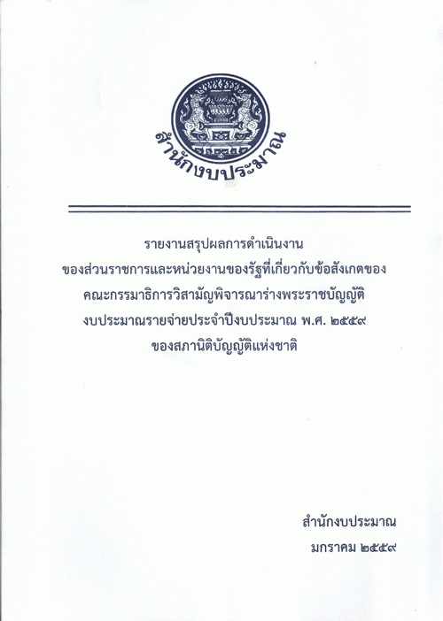 รายงานสรุปผลการดำเนินงานของส่วนราชการและหน่วยงานของรัฐที่เกี่ยวกับข้อสังเกตของคณะกรรมาธิการวิสามัญพิจารณาร่างพระราชบัญญัติงบประมาณรายจ่ายประจำปีงบประมาณ พ.ศ. 2559 ของสภานิติบัญญัติแห่งชาติ / สำนักงบประมาณ สำนักนายกรัฐมนตรี.