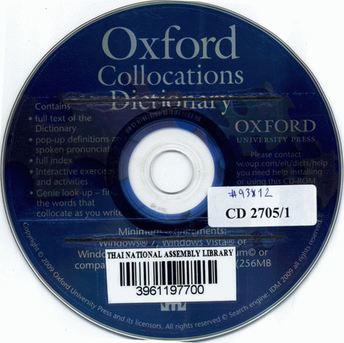 System requirements: Multimedia PC with Pentium II or equivalent; 64Mb RAM Windows 98, NT 4.0 (service pack 6), 2000, Me; 128Mb RAM Windows XP; 800x600 screen resolution capable of displaying thousands of colours; Full install: 310 Mb available on hard disk; requiring CD-ROM 75 Mb available on hard disk. A combined ed. of two separately published works: Oxford dictionary of collocations, and the Oxford advanced learner's dictionary.