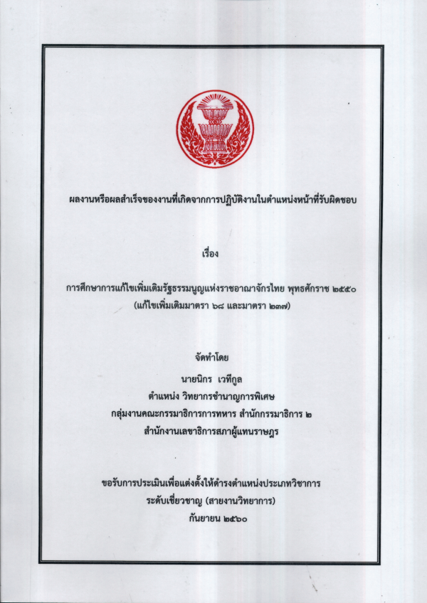 การศึกษาการแก้ไขเพิ่มเติมรัฐธรรมนูญแห่งราชอาณาจักรไทย พุทธศักราช 2550 (แก้ไขเพิ่มเติมมาตรา 68 และมาตรา 237) / นิกร เวทีกูล.
