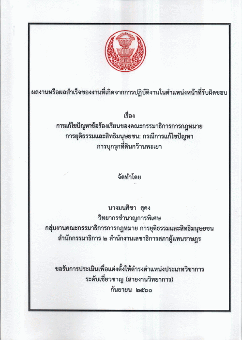 การแก้ไขปัญหาข้อร้องเรียนของคณะกรรมาธิการการกฎหมาย การยุติธรรมและสิทธิมนุษยชน : กรณีการแก้ไขปัญหาการบุกรุกที่ดินกว๊านพะเยา / มนศิชา สุคง.