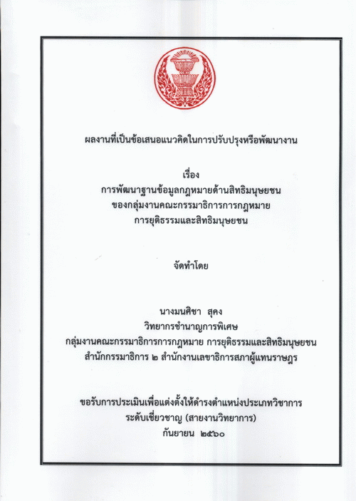 การพัฒนาฐานข้อมูลกฎหมายด้านสิทธิมนุษยชนของกลุ่มงานคณะกรรมาธิการการกฎหมาย การยุติธรรมและสิทธิมนุษยชน / มนศิชา สุคง.