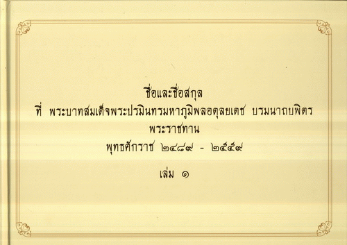 ชื่อและชื่อสกุลที่ พระบาทสมเด็จพระปรมินทรมหาภูมิพลอดุลยเดช บรมนาถบพิตร พระราชทาน พุทธศักราช 2489 - 2559 เล่ม 1 / กรมราชเลขานุการในพระองค์ สำนักพระราชวัง.