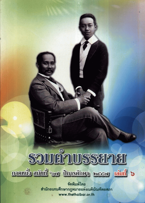รวมคำบรรยาย ภาคหนึ่ง สมัยที่ 67 ปีการศึกษา 2557 เล่มที่ 6 / สำนักอบรมศึกษากฎหมายแห่งเนติบัณฑิตยสภา ; บรรณาธิการ ประเสริฐ เสียงสุทธิวงศ์.