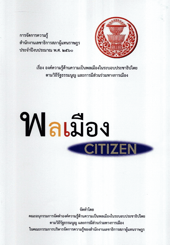 องค์ความรู้ด้านความเป็นพลเมืองในระบอบประชาธิปไตยตามวิถีรัฐธรรมนูญ และการมีส่วนร่วมทางการเมือง : พลเมือง (Citizen) / คณะอนุกรรมการจัดทำองค์ความรู้ด้านความเป็นพลเมืองในระบอบประชาธิปไตยตามวิถีรัฐธรรมนูญ และการมีส่วนร่วมทางการเมือง ในคณะกรรมการบริหารจัดการความรู้ของสำนักงานเลขาธิการสภาผู้แทนราษฎร.