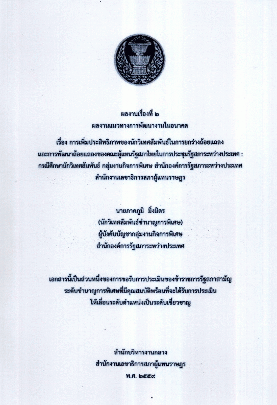 การเพิ่มประสิทธิภาพของนักวิเทศสัมพันธ์ในการยกร่างถ้อยแถลงและการพัฒนาถ้อยแถลงของคณะผู้แทนรัฐสภาไทยในการประชุมรัฐสภาระหว่างประเทศ : กรณีศึกษานักวิเทศสัมพันธ์ กลุ่มงานกิจการพิเศษ สำนักองค์การรัฐสภาระหว่างประเทศ สำนักงานเลขาธิการสภาผู้แทนราษฎร / ภาคภูมิ มิ่งมิตร.