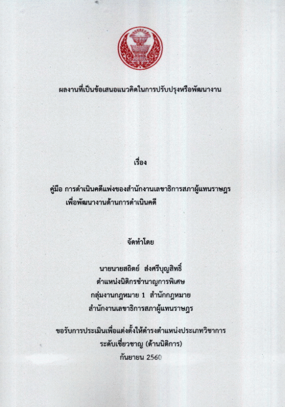 คู่มือการดำเนินคดีแพ่งของสำนักงานเลขาธิการสภาผู้แทนราษฎร เพื่อพัฒนางานด้านการดำเนินคดี / สถิตย์ ส่งศรีบุญสิทธิ์.