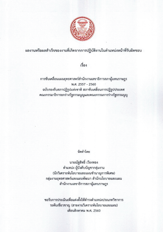 การขับเคลื่อนแผนยุทธศาสตร์สำนักงานเลขาธิการสภาผู้แทนราษฎร พ.ศ. 2557 - 2560 ฉบับรองรับสภาปฏิรูปแห่งชาติ สภาขับเคลื่อนการปฏิรูปประเทศ คณะกรรมาธิการยกร่างรัฐธรรมนูญและคณะกรรมการร่างรัฐธรรมนูญ / ณัฐสิทธิ์ เวียงทอง.