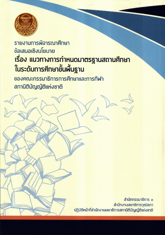 รายงานการพิจารณาศึกษาข้อเสนอเชิงนโยบาย เรื่อง แนวทางการกำหนดมาตรฐานสถานศึกษาในระดับการศึกษาขั้นพื้นฐาน ของคณะกรรมาธิการการศึกษาและการกีฬา สภานิติบัญญัติแห่งชาติ / สำนักกรรมาธิการ 3 สำนักงานเลขาธิการวุฒิสภา ปฏิบัติหน้าที่สำนักงานเลขาธิการสภานิติบัญญัติแห่งชาติ.