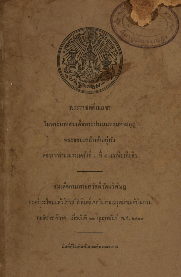 สมเด็จกรมพระสวัสดิ์วัดนวิศิษฎ ทรงชำระใหม่แล้วโปรสให้พิมพ์แจกในงานเมรุหม่อมเจ้าในกรม ณวัดราชาธิวาศ เมื่อวันที่ 22 กุมภาพันธ์ พ.ศ. 2473.