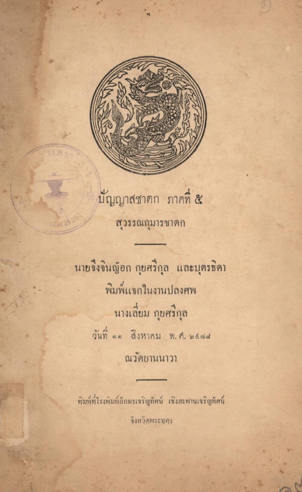 นายจึงจินญ๊อก กุยศรีกุล และบุตรธิดา พิมพ์แจกในงานปลงศพ นางเลี่ยม กุยศรีกุล วันที่ 11 สิงหาคม พ.ศ. 2478 ณวัดยานนาวา.