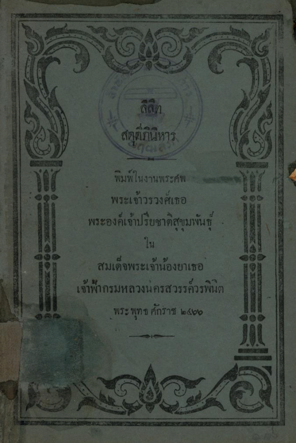 พิมพ์ในงานพระศพ พระเจ้าวรวงศ์เธอ พระองค์เจ้าปรียชาติสุขุมพันธุ์ในสมเด็จพระเจ้าน้องยาเธอ เจ้าฟ้ากรมหลวงนครสวรรค์วรพินิต พระพุทธศักราช 2466.