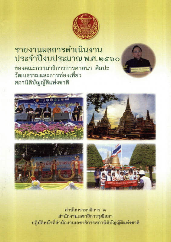 รายงานผลการดำเนินงาน ประจำปีงบประมาณ พ.ศ.2560 ของคณะกรรมาธิการการศาสนา ศิลปะ วัฒนธรรมและการท่องเที่ยว สภานิติบัญญัติแห่งชาติ / สำนักกรรมาธิการ 3 สำนักงานเลขาธิการวุฒิสภา ปฏิบัติหน้าที่สำนักงานเลขาธิการสภานิติบัญญัติแห่งชาติ.