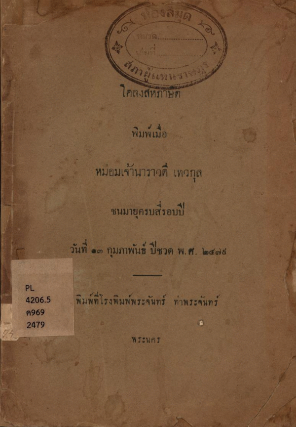 National Assembly Library of Thailand | Rarebook collection | Rarebook shelves | PL 4206.5 ค969 2479 (เรียกดูชั้นหนังสือ(เปิดด้านล่าง)) | ไม่อนุญาตให้ยืมออก | 3961214354 |