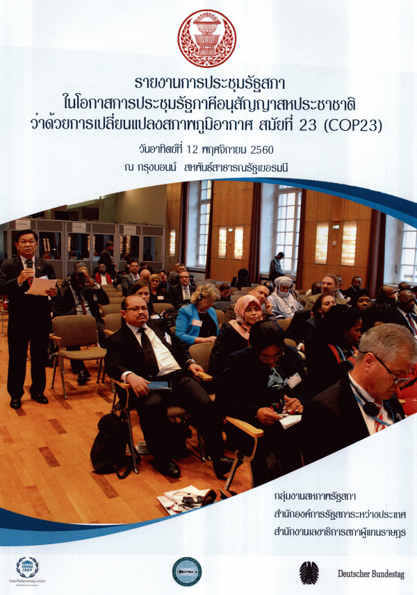 รายงานการประชุมรัฐสภาในโอกาสการประชุมรัฐสภาคีอนุสัญญาสหประชาชาติว่าด้วยการเปลี่ยนแปลงสภาพภูมิอากาศ สมัยที่ 23 (COP23) ณ กรุงบอนน์ สหพันธ์สาธารณรัฐเยอรมนี / สำนักองค์การรัฐสภาระหว่างประเทศ สำนักงานเลขาธิการสภาผู้แทนราษฎร.