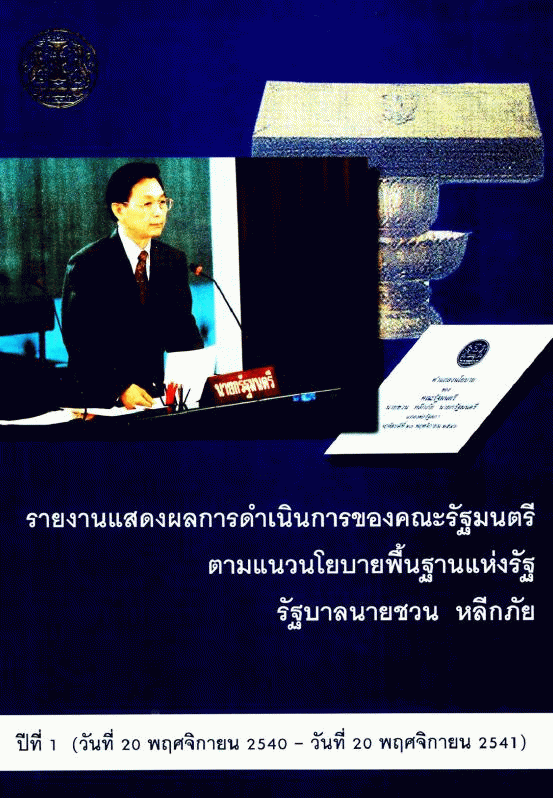 รายงานแสดงผลการดำเนินการของคณะรัฐมนตรี ตามแนวนโยบายพื้นฐานแห่งรัฐ รัฐบาลนายชวน หลีกภัย ปีที่ 1 (วันที่ 20 พฤศจิกายน 2540 - วันที่ 20 พฤศจิกายน 2541) / สำนักเลขาธิการคณะรัฐมนตรี.