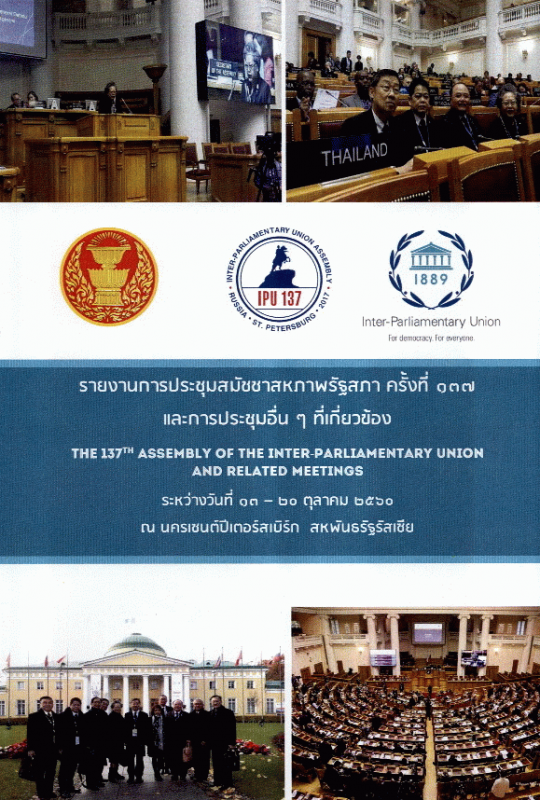รายงานการประชุมสมัชชาสหภาพรัฐสภา ครั้งที่ 137 และการประชุมอื่น ๆ ที่เกี่ยวข้อง ระหว่างวันที่ 13 - 20 ตุลาคม 2560 ณ นครเซนต์ปีเตอร์สเบิร์ก สหพันธรัฐรัสเซีย = The 137th Assembly of the Inter-Parliamentary Union and related meetings / สำนักองค์การรัฐสภาระหว่างประเทศ สำนักงานเลขาธิการสภาผู้แทนราษฎร.