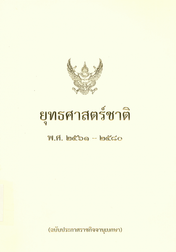 ยุทธศาสตร์ชาติ พ.ศ. 2561 - 2580 (ฉบับประกาศราชกิจจานุเบกษา) / สำนักงานเลขานุการของคณะกรรมการยุทธศาสตร์ชาติ สำนักงานคณะกรรมการพัฒนาการเศรษฐกิจและสังคมแห่งชาติ.