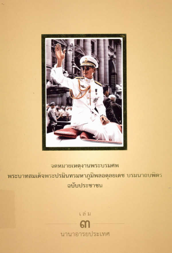 จดหมายเหตุงานพระบรมศพพระบาทสมเด็จพระปรมินทรมหาภูมิพลอดุลยเดช บรมนาถบพิตร ฉบับประชาชน เล่ม 3 นานาอารยประเทศ / กระทรวงวัฒนธรรม.