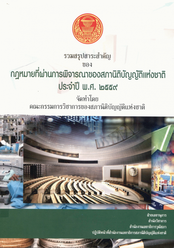 รวมสรุปสาระสำคัญของกฎหมายที่ผ่านการพิจารณาของสภานิติบัญญัติแห่งชาติ ประจำปี พ.ศ. 2559 / จัดทำโดย คณะกรรมการวิชาการของสภานิติบัญญัติแห่งชาติ.