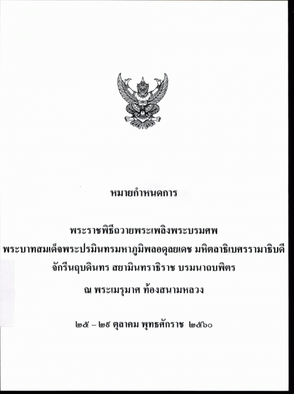 หมายกำหนดการพระราชพิธีถวายพระเพลิงพระบรมศพ พระบาทสมเด็จพระปรมินทรมหาภูมิพลอดุลยเดช มหิตลาธิเบศรรามาธิบดี จักรีนฤบดินทร สยามินทราธิราช บรมนาถบพิตร ณ พระเมรุมาศ ท้องสนามหลวง 25 - 29 ตุลาคม พุทธศักราช 2560.