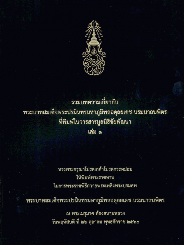รวมบทความเกี่ยวกับพระบาทสมเด็จพระปรมินทรมหาภูมิพลอดุลยเดช บรมนาถบพิตร ที่พิมพ์ในวารสารมูลนิธิชัยพัฒนา เล่ม 1 / มูลนิธิชัยพัฒนา.