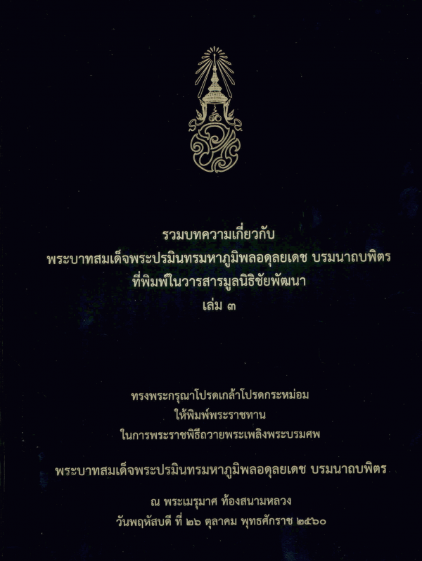 รวมบทความเกี่ยวกับพระบาทสมเด็จพระปรมินทรมหาภูมิพลอดุลยเดช บรมนาถบพิตร ที่พิมพ์ในวารสารมูลนิธิชัยพัฒนา เล่ม 3 / มูลนิธิชัยพัฒนา.